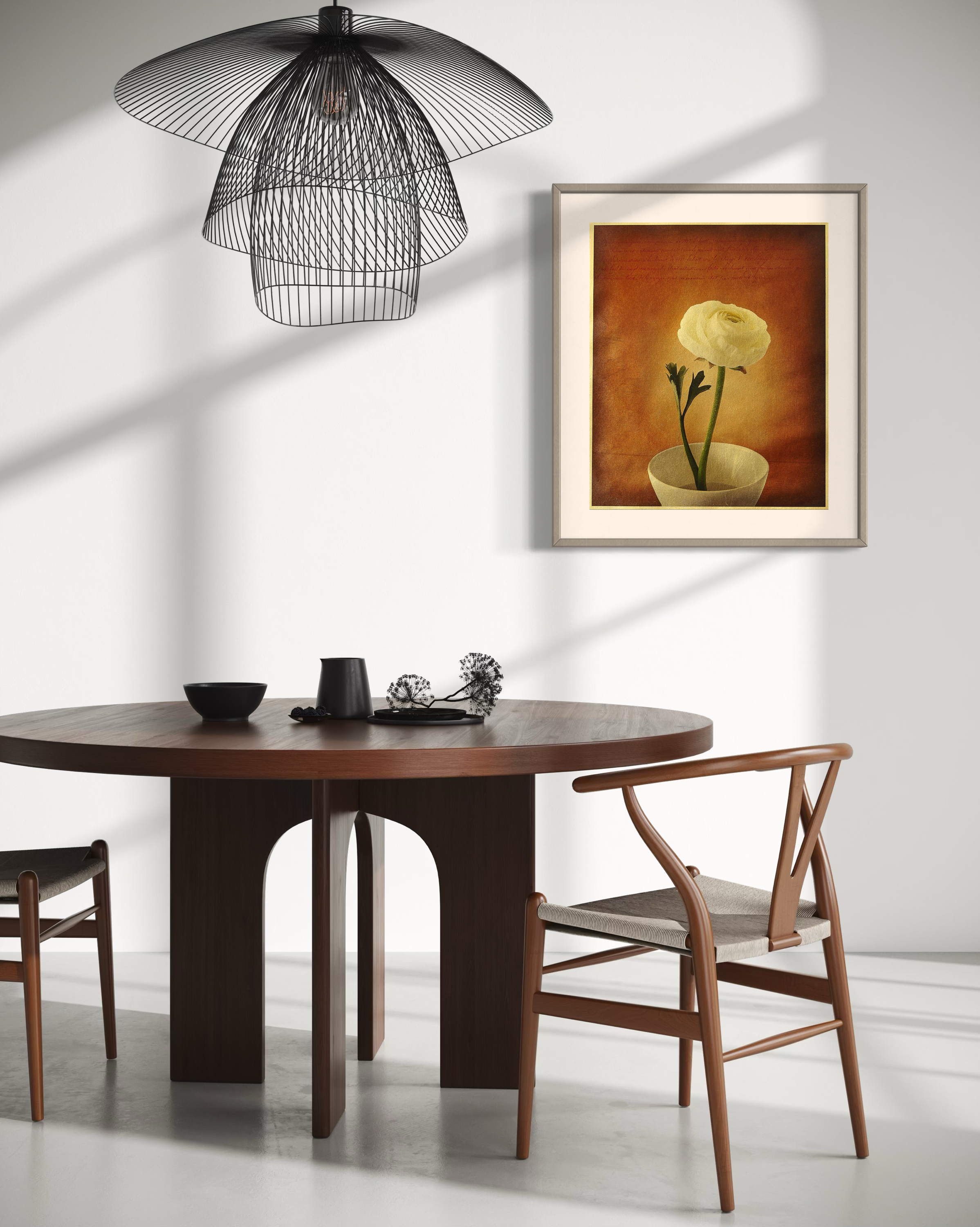 A single white ranunculus blossom poised on a complimentary warm colored field reflecting the golden light from the luminous gold colored gilding. This stunning piece will bring a radiant light to any wall. These gilded vellums love light bouncing around a room.